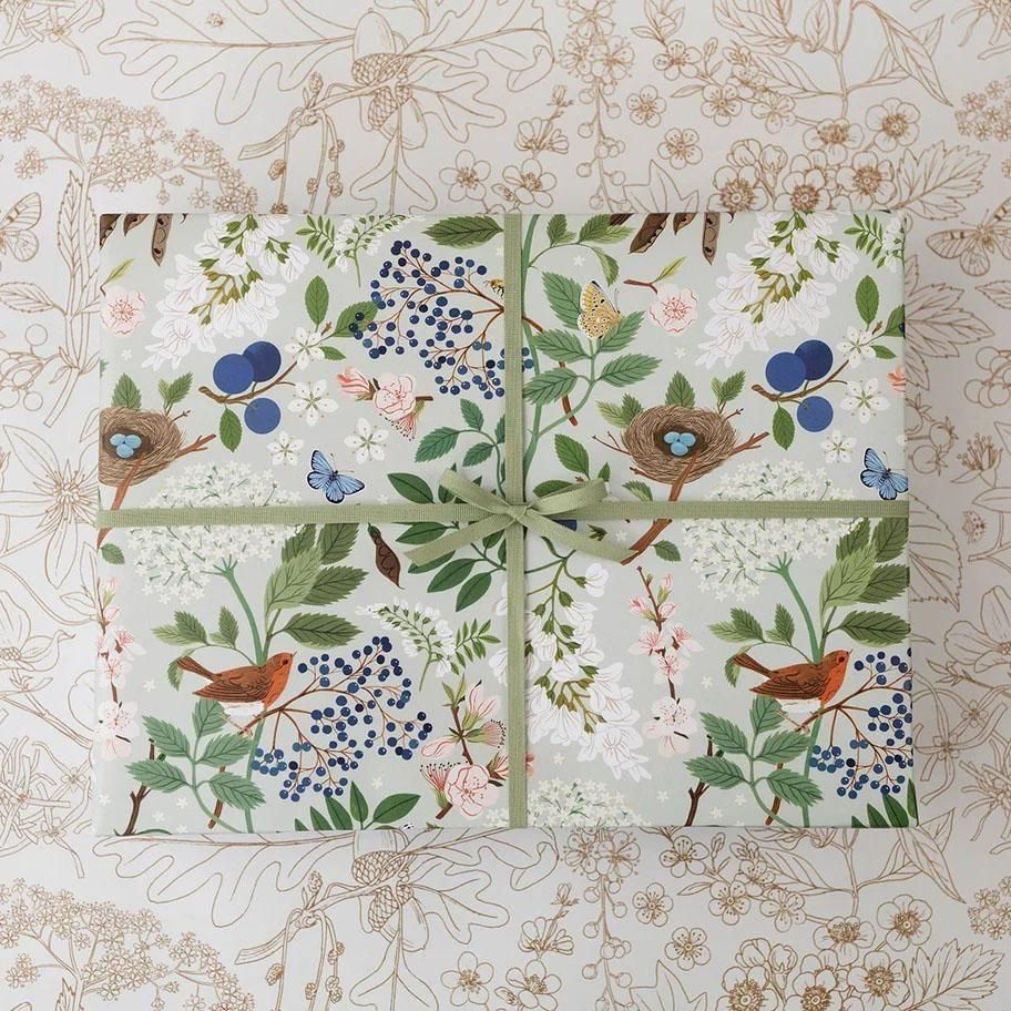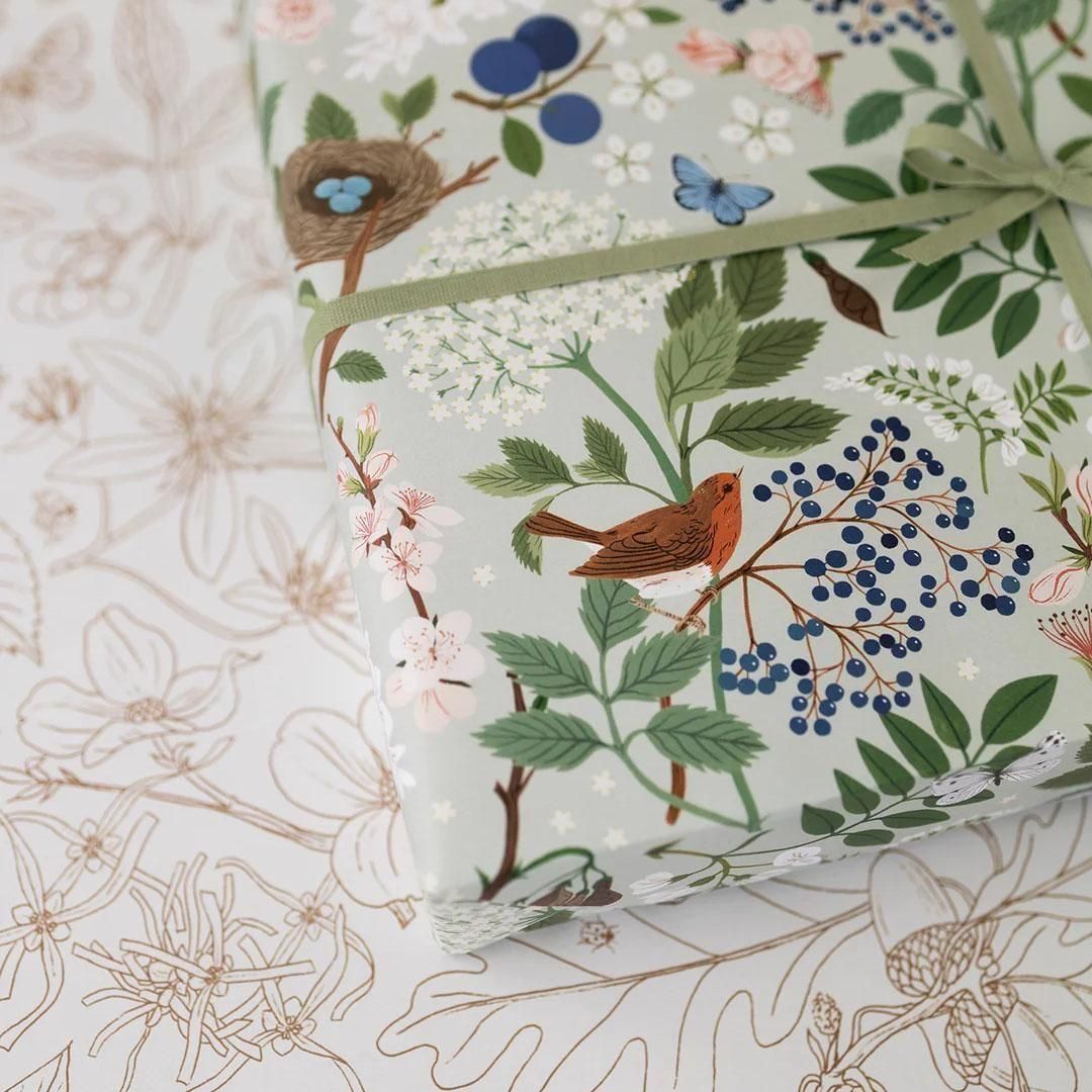 自然の中にある植物や花をモチーフに、やさしい色合いと繊細なタッチで描かれた美しい両面包装紙。