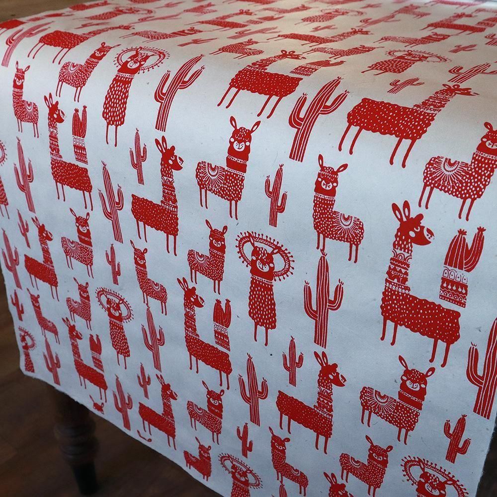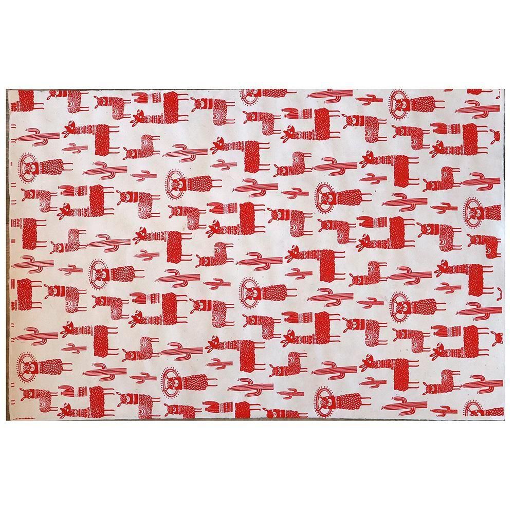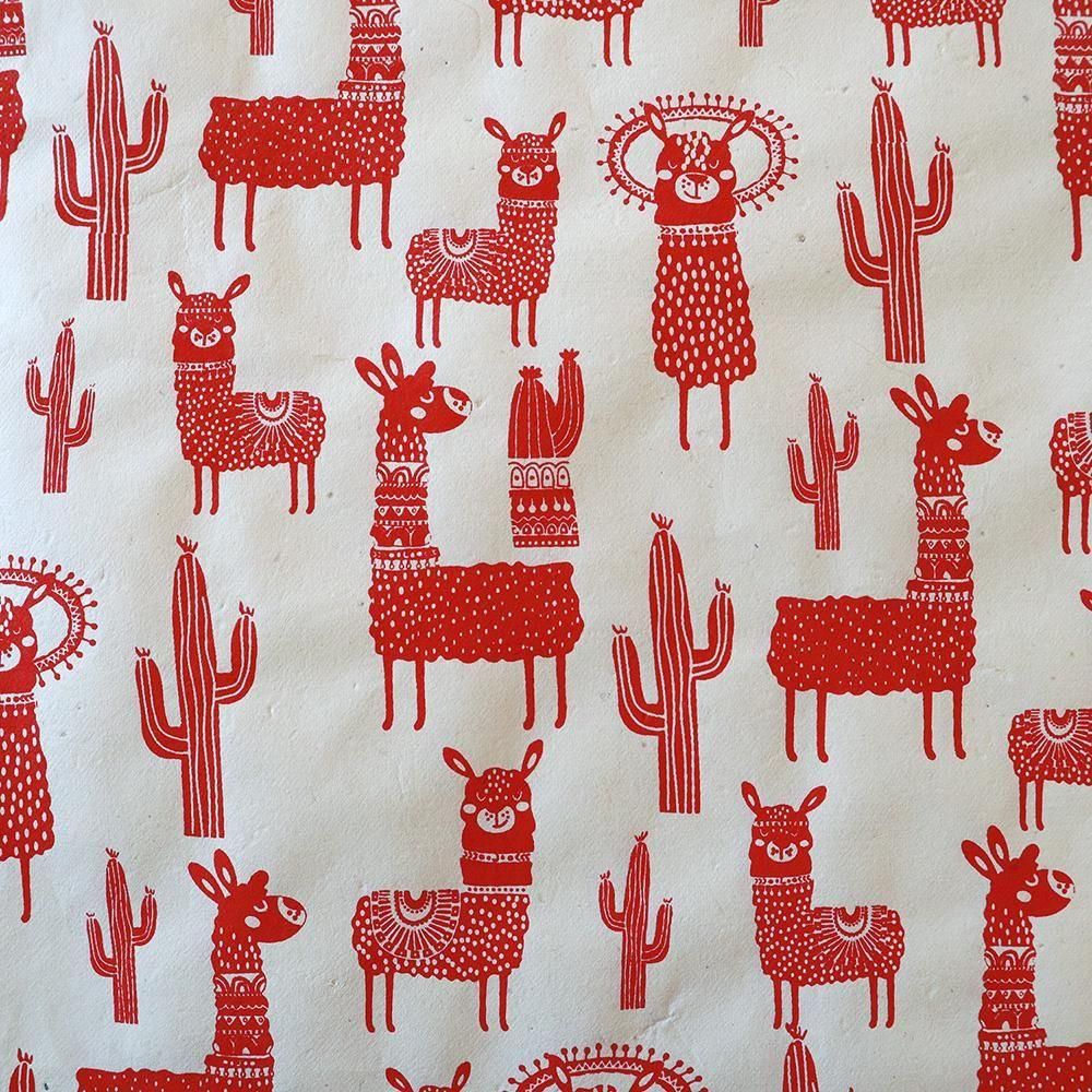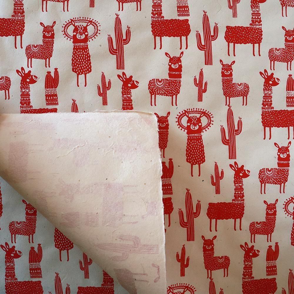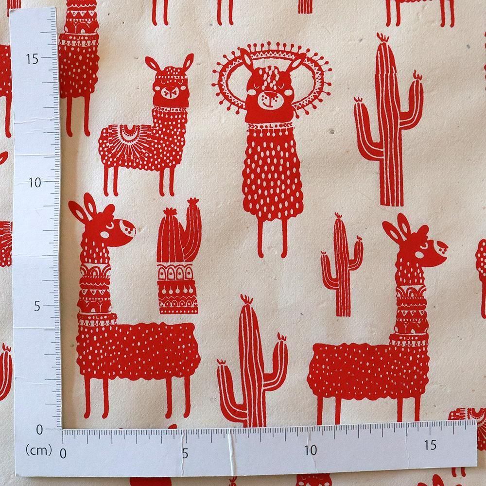 ネパール手漉き紙アルパカとサボテン柄ペーパー/レッド/包装紙/ラッピングペーパー